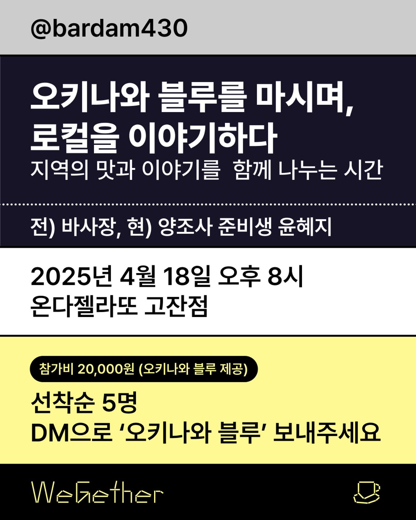 분명 이곳에도 흥미롭고 다양한 사람들이 살고 있지만, 안산은 서울과 가까운 주거 도시라는 특성 때문인지 잘 드러나지 않는 것이 늘 아쉬웠습니다. 그래서 도시 속 사람들과 캐주얼하게 소통할 수 있는 공간이 필요했고, 그렇게 Wegether Ansan이 시작되었습니다.시작한 지 3개월쯤 되었을 때, 실제로 안산의 다양한 전문가들이 “호스트를 해 보고 싶다”라며 연락을 주었습니다. 저희는 그들과 함께 숏폼 워크숍, 브랜딩 스터디, 양조장 투어 등을 기획했고, 더 많은 사람들이 모여들기 시작했습니다. 프랑스 친구와 음식을 만들며 문화를 나누고, 강화도의 로컬 브랜드를 만나고, 방콕과 홍콩에서 디자인과 미식을 탐험하는 경험도 이어갔습니다. 그렇게 Wegether Ansan은 안산을 기반으로 하면서도 세계와 연결되는 커뮤니티로 자리 잡아갔습니다.